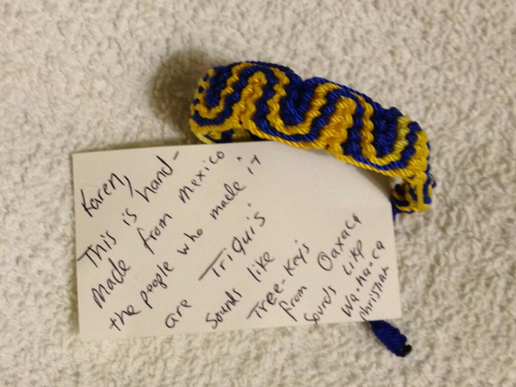 Die Rezeptionistin hat mir dann noch ein Geschenk übergeben, vom Missionar. Ein selbstgemachtes Armband von den Triquis. Ist doch nett 🙂